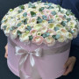 На фото 101 белый ранункулюс в коробке. В составе: ранункулюс 101 шт, оазис флористический 2 шт, шляпная коробка (xl) 1 шт, . Все цветы свежие и ароматные, букет красиво оформлен и отлично подходит для подарка. Доступна доставка цветов или самовывоз.