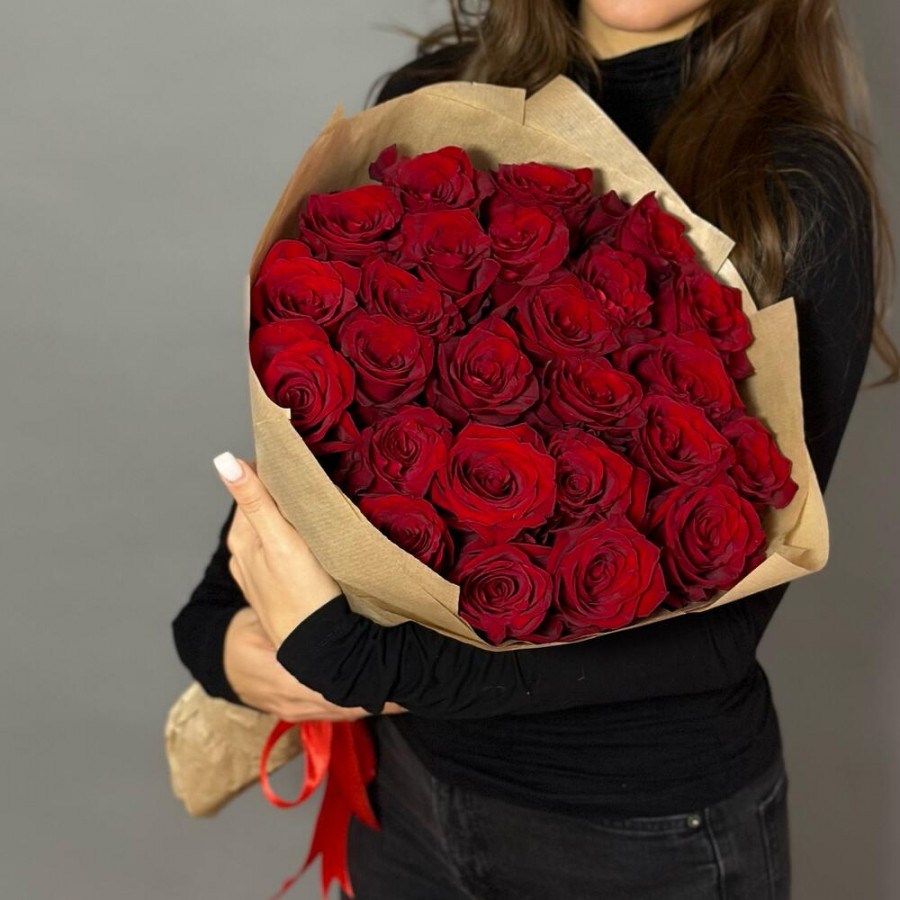 На фото букет из 25 бордовых роз. В составе: роза 25 шт, дизайнерская упаковка 1 шт, атласная лента 2 шт, . Все цветы свежие и ароматные, букет красиво оформлен и отлично подходит для подарка. Доступна доставка цветов или самовывоз.