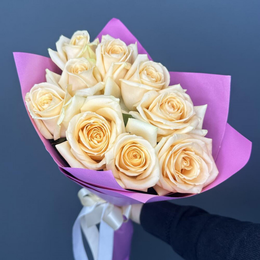На фото букет из 9 кремовых роз. В составе: роза 9 шт, фоамиран 2 шт, атласная лента 1 шт, . Все цветы свежие и ароматные, букет красиво оформлен и отлично подходит для подарка. Доступна доставка цветов или самовывоз.