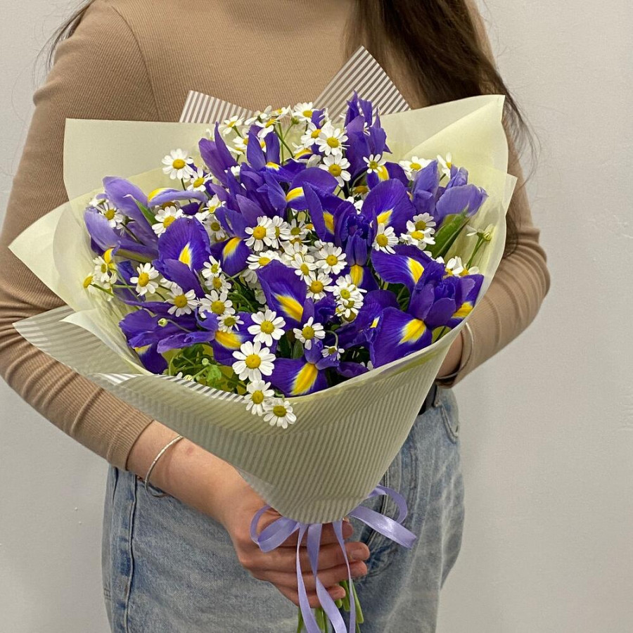 На фото букет «луговая сказка». В составе: ирис 5 шт, танацетум 4 шт, дизайнерская упаковка 1 шт, атласная лента 1 шт, . Все цветы свежие и ароматные, букет красиво оформлен и отлично подходит для подарка. Доступна доставка цветов или самовывоз.