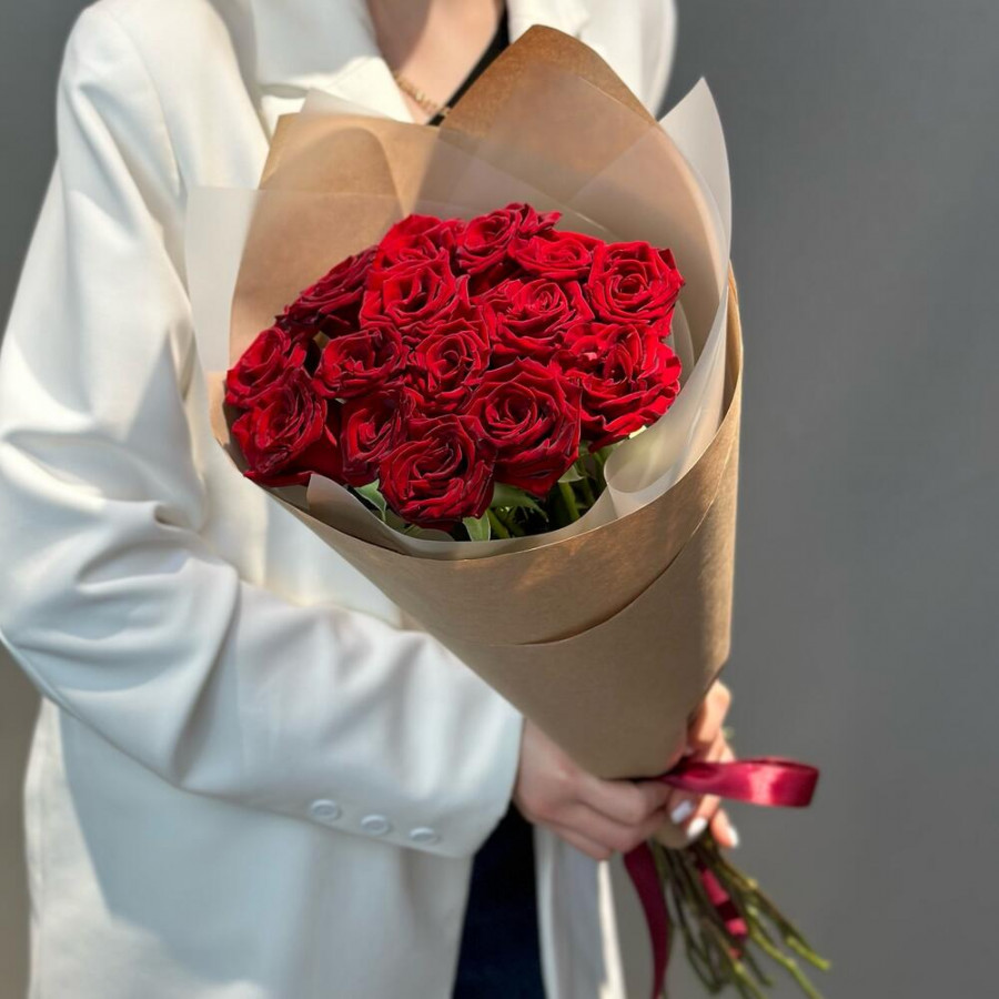 Средство для продления жизни цветов - 1 шт. Упаковка крафт - 1 шт. роза красная кения - 15 шт. записка с вашим текстом - 1 шт.
