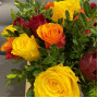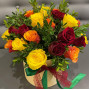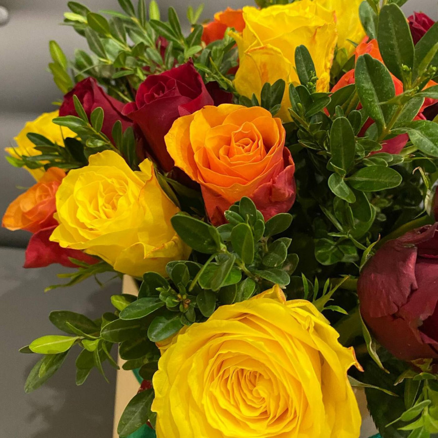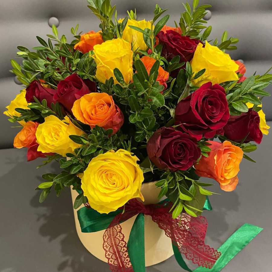 На фото желтые и красные розы в шляпной коробке. В составе: роза (кения) 25 шт, писташ 4 шт, шляпная коробка (s) 1 шт, атласная лента 1 шт, . Все цветы свежие и ароматные, букет красиво оформлен и отлично подходит для подарка. Доступна доставка цветов или самовывоз.
